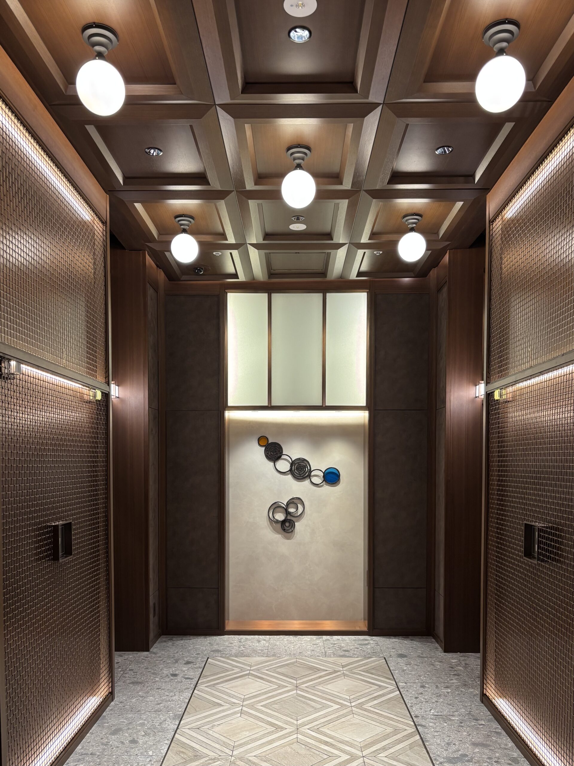 1階エントランスのリニューアルに伴い、2つあるエレベーターホールにそれぞれレリーフ状の作品2点を組み合わせ設置した。高層階用には色ガラスを嵌め込んだもの、低層階用には立体性を強調した動きの感じられるものを配した。4点とも作家自身の手により溶断された様々な大きさ・表情をもった鉄の輪が溶接により組み上げられたもの。照明により、色ガラスの色彩や立体性が浮かび上がり、設置効果をあげている。